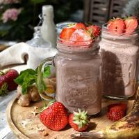 Die gekühlte Bananenmilch in einen Mixer geben und mit den Erdbeeren, 200 ml kalter Mandelmilch, dem Zitronensaft, fein geschnittenen Minzblättern und etwas gepresstem Ingwer vermischen (Menge nach Geschmack). Zuletzt einige Eiswürfel zum verzehrfertigen Hafershake geben und nach Belieben verzieren.