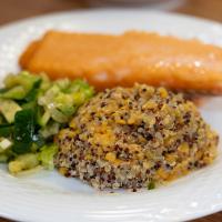 Den Feta-Käse würfeln und mit dem gedünsteten Gemüse unter die Quinoa mischen. Mit Zitrone abschmecken.