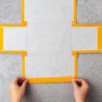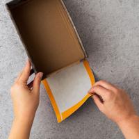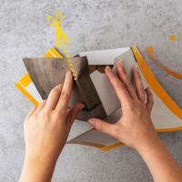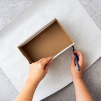 Zum Schluss die schmalen Seiten am Karton festkleben und ebenfalls nach innen einschlagen. Den Deckel des Kartons nach gleichem Prinzip einschlagen.