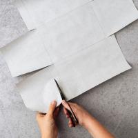 Nun zuerst die Längsseiten an den Kartons kleben und die Überlappungen einmal um die Ecken schlagen. Den Umschlag oben bis zum Karton einschneiden, sodass der Einschlag an der Innenseite fixiert werden kann.