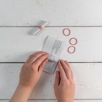 Das Papier in 4 kleine Röllchen mit einem Durchmesser von ca. 2 cm einrollen. Jedes Röllchen mit jeweils einem Haushaltsgummi fixieren.