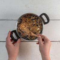 Das Fett in einem Topf oder in der Mikrowelle zum Schmelzen bringen und das Vogelfutter hinzugeben. Alles gut vermengen.