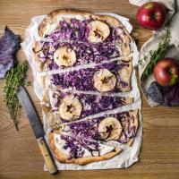 Den Kohl zusammen mit den Äpfeln und der Schalotte auf die Fladen geben. 10 - 12 Minuten backen und anschließend mit Thymian bestreuen.