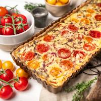 Restliche Zutaten für die Füllung miteinander verrühren und auf den Quicheteig geben. Zum Schluss die Tomaten hinzugeben. Quiche für 35-40 Minuten backen und lauwarm servieren.