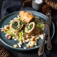 Spinat mit Frischkäse vermengen und auf dem Fleisch verteilen. Schnitzel aufrollen und mit Nadeln fixieren. Öl in Topf oder Pfanne mit Deckel erhitzen und die Rollen von allen Seiten kräftig anbraten. Brühe hinzugeben, Deckel schließen und 20 Minuten köcheln.