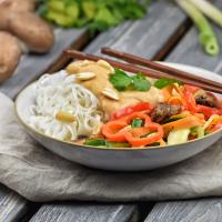 Soße und Reisnudeln mit dem Gemüse vermengen, nochmals abschmecken und kurz zusammen für 10 Minuten erwärmen. Anrichten und mit fein gehackter Petersilie sowie ein paar gerösteten Erdnusshälften toppen.