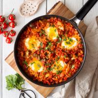 Mit einem Löffel 5 kleine Mulden formen und die Eier hineingeben. Die Pfanne abdecken und auf kleiner Flamme weitere 5 - 8 Minuten köcheln lassen. Das Eigelb sollte beim Servieren noch flüssig sein. Zum Schluss die Shakshuka mit Petersilie und Koriander bestreuen.