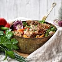 Nun das Gemüse und die Kräuter waschen und schneiden. Brate das Gemüse mit etwas Kokosöl scharf an und würze es ausreichend. Mit der Mandelmilch ablöschen und den Geschmack mit der restlichen gepressten Knoblauchzehe sowie mit den geschnittenen Kräutern veredeln. Anschließend den restlichen Honig unterrühren. Alles für rund 10 Minuten bei geringer Hitze köcheln lassen.