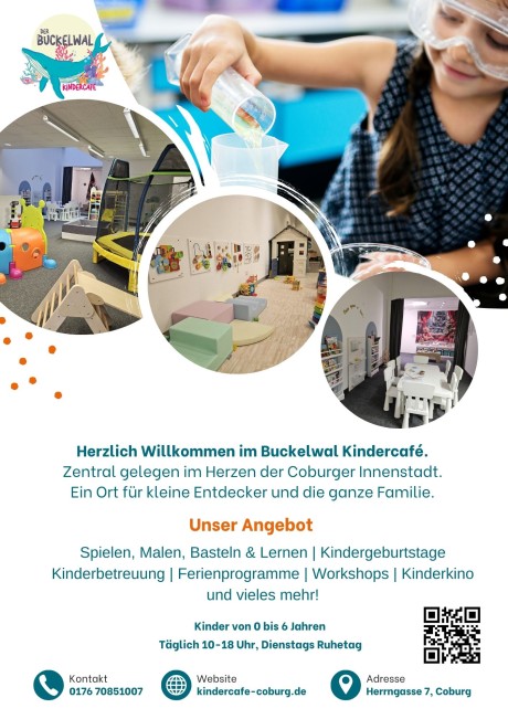 Das Kindercafé Buckelwal befindet sich ganz zentral in der Herrengasse 7 in Coburg. Kinder von 0 - 6 Jahren finden dort jede Menge Raum zum Spielen, Entdecken und Lernen. Ältere Kinder sind regelmäßig zu spannenden Workshops z.B. aus den Bereichen Robotik, Programmierung, Sprachen oder naturwissenschaftliche Experimente eingeladen.