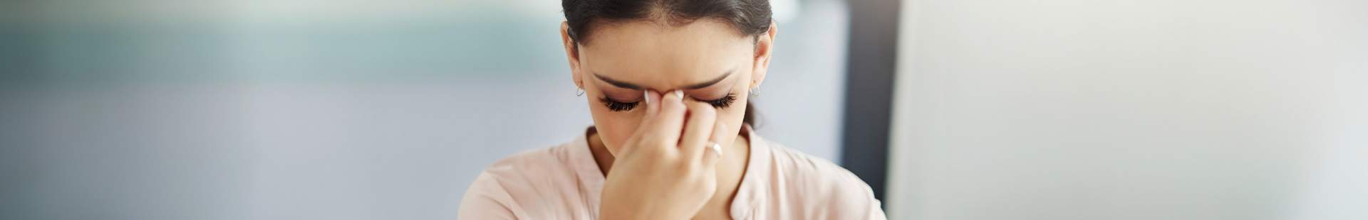 Eine Frau hat die Augen geschlossen und fasst sich mit zwei Fingern an die Stirn.